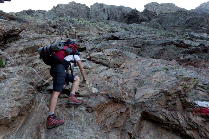 Nous débutons une ascension exigeante. L’entrée du cirque ne vient pas vite. Mais il n’y a personne devant nous et aucun signe de randonneur suiveur. Serions-nous vraiment les premiers ? Nous arrivons au bout d’une heure en vue de l’entrée du cirque. Devant nous, un large cirque plein d’éboulis. On entend d’ailleurs des pierres tomber au loin, on s’arrête, on observe, puis on aperçoit un premier mouflon, puis un second avec un petit, puis tout un troupeau qui nous a repérés et s’enfuit bruyamment. A l’occasion, on constate que le mouflon bêle comme un mouton normal. Le privilège des premiers ! On arrive enfin au col après 1h20 de marche. Le Cirque de la Solitude, première impression: ca descend sec par un chemin d’éboulis puis on perd le chemin qui oblique très rapidement. Avant de s’engager, on aperçoit sur un promontoire un nouveau mouflon. On s’engage enfin dans la partie la plus légendaire du GR 20. On a tout entendu sur lui : qu’il avait des passages á pic, des parois presque verticales, qu’il est impraticable si la météo est mauvaise et vite encombré si il y a des groupes… oui, c’est aussi pour cela que l’on s’est levé aux aurores. Coté météo, c’est grand beau. Nous pénétrons dans le cirque : le silence est juste interrompu par les piaillements des chocards (les Alpendohlen amis) et par quelques rafales de vent. Après une descente dans un raidillon avec éboulis, on arrive bientôt à un bloc avec des chaines. Juste avant de s’engager dans le passage délicat, on rencontre un groupe de coureurs qui vient en sens inverse et qui nous confirme que nous sommes les premiers qu’ils croisent. Grosse fierté !